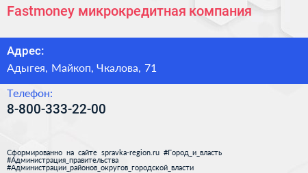 Fastmoney, микрокредитная компания по адресу Адыгея, Майкоп, Чкалова, 71 в дальнейшем Организация, размещена в следующих категориях: