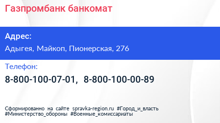 Газпромбанк, банкомат по адресу Адыгея, Майкоп, Пионерская, 276 в дальнейшем Организация, размещена в следующих категориях: