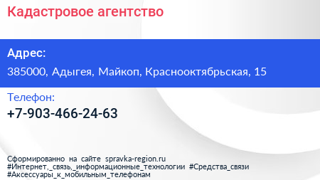 Кадастровое агентство по адресу 385000, Адыгея, Майкоп, Краснооктябрьская, 15 в дальнейшем Организация, размещена в следующих категориях: