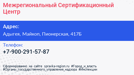 Межрегиональный Сертификационный Центр по адресу Адыгея, Майкоп, Пионерская, 417Б в дальнейшем Организация, размещена в следующих категориях: