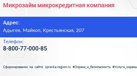 Микрозайм, микрокредитная компания по адресу Адыгея, Майкоп, Крестьянская, 207 в дальнейшем Организация, размещена в следующих категориях: