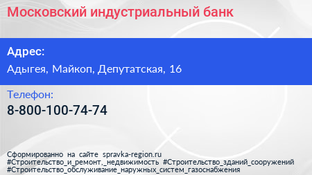 Московский индустриальный банк по адресу Адыгея, Майкоп, Депутатская, 16 в дальнейшем Организация, размещена в следующих категориях: