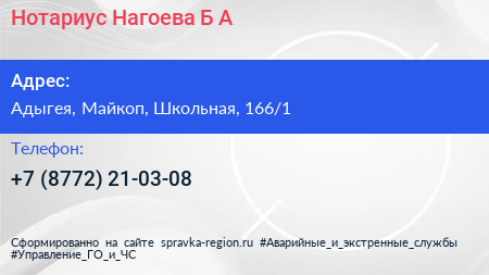 Нотариус Нагоева Б.А. по адресу Адыгея, Майкоп, Школьная, 166/1 в дальнейшем Организация, размещена в следующих категориях: