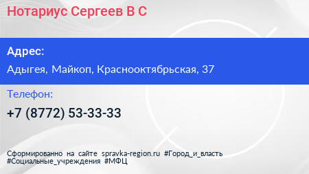 Нотариус Сергеев В.С. по адресу Адыгея, Майкоп, Краснооктябрьская, 37 в дальнейшем Организация, размещена в следующих категориях: