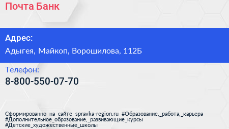Почта Банк по адресу Адыгея, Майкоп, Ворошилова, 112Б в дальнейшем Организация, размещена в следующих категориях: