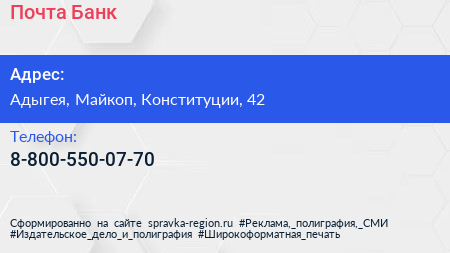 Почта Банк по адресу Адыгея, Майкоп, Конституции, 42 в дальнейшем Организация, размещена в следующих категориях: