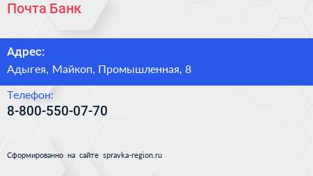 Почта Банк по адресу Адыгея, Майкоп, Промышленная, 8 в дальнейшем Организация, размещена в следующих категориях: