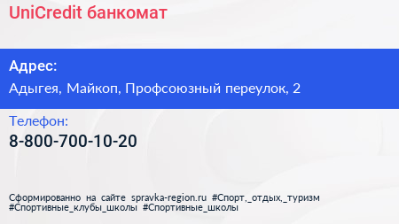 UniCredit, банкомат по адресу Адыгея, Майкоп, Профсоюзный переулок, 2 в дальнейшем Организация, размещена в следующих категориях: