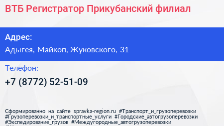 ВТБ Регистратор, Прикубанский филиал по адресу Адыгея, Майкоп, Жуковского, 31 в дальнейшем Организация, размещена в следующих категориях: