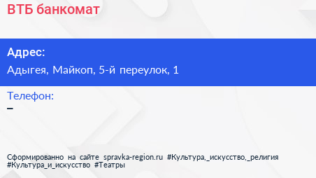 ВТБ, банкомат по адресу Адыгея, Майкоп, 5-й переулок, 1 в дальнейшем Организация, размещена в следующих категориях: