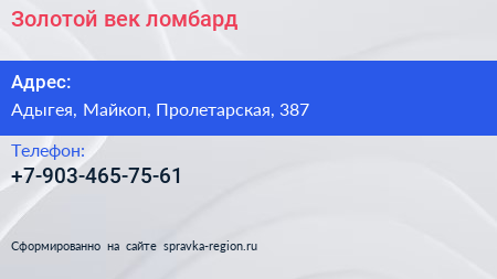 Золотой век, ломбард по адресу Адыгея, Майкоп, Пролетарская, 387 в дальнейшем Организация, размещена в следующих категориях:
