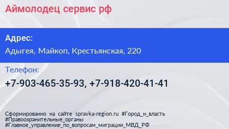 Аймолодец-сервис.рф по адресу Адыгея, Майкоп, Крестьянская, 220 в дальнейшем Организация, размещена в следующих категориях: