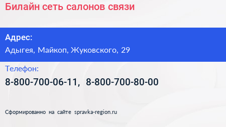 Билайн, сеть салонов связи по адресу Адыгея, Майкоп, Жуковского, 29 в дальнейшем Организация, размещена в следующих категориях: