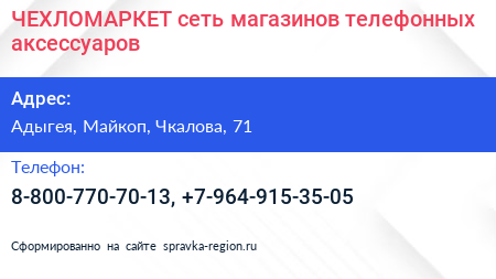 ЧЕХЛОМАРКЕТ, сеть магазинов телефонных аксессуаров по адресу Адыгея, Майкоп, Чкалова, 71 в дальнейшем Организация, размещена в следующих категориях: