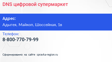 DNS, цифровой супермаркет по адресу Адыгея, Майкоп, Шоссейная, 1в в дальнейшем Организация, размещена в следующих категориях: