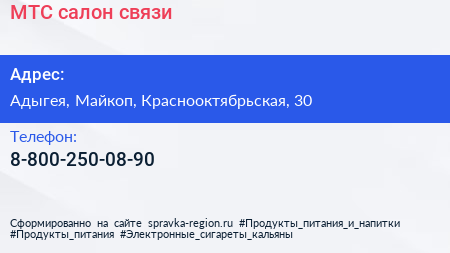 МТС, салон связи по адресу Адыгея, Майкоп, Краснооктябрьская, 30 в дальнейшем Организация, размещена в следующих категориях: