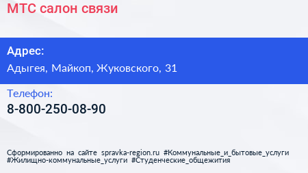 МТС, салон связи по адресу Адыгея, Майкоп, Жуковского, 31 в дальнейшем Организация, размещена в следующих категориях: