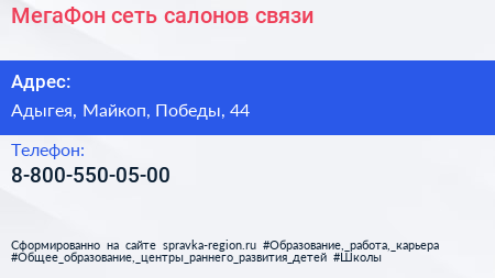 МегаФон, сеть салонов связи по адресу Адыгея, Майкоп, Победы, 44 в дальнейшем Организация, размещена в следующих категориях: