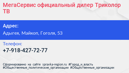 МегаСервис, официальный дилер Триколор ТВ по адресу Адыгея, Майкоп, Гоголя, 53 в дальнейшем Организация, размещена в следующих категориях: