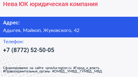 Нева-ЮК, юридическая компания по адресу Адыгея, Майкоп, Жуковского, 42 в дальнейшем Организация, размещена в следующих категориях: