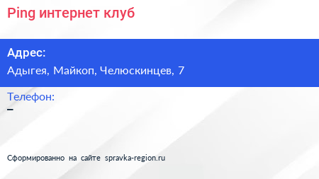 Ping, интернет-клуб по адресу Адыгея, Майкоп, Челюскинцев, 7 в дальнейшем Организация, размещена в следующих категориях: