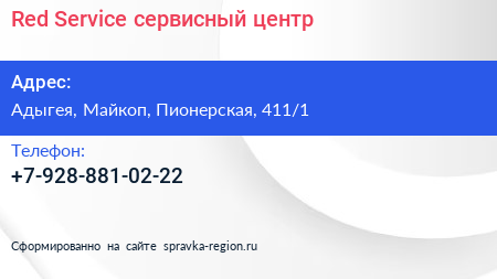 Red. Service, сервисный центр по адресу Адыгея, Майкоп, Пионерская, 411/1 в дальнейшем Организация, размещена в следующих категориях: