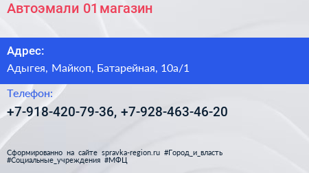 Автоэмали-01, магазин по адресу Адыгея, Майкоп, Батарейная, 10а/1 в дальнейшем Организация, размещена в следующих категориях: