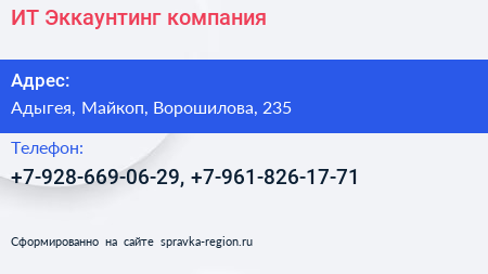ИТ-Эккаунтинг, компания по адресу Адыгея, Майкоп, Ворошилова, 235 в дальнейшем Организация, размещена в следующих категориях: