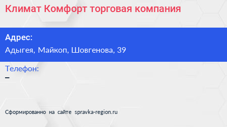 Климат Комфорт, торговая компания по адресу Адыгея, Майкоп, Шовгенова, 39 в дальнейшем Организация, размещена в следующих категориях: