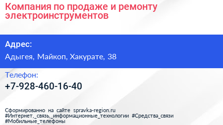 Компания по продаже и ремонту электроинструментов по адресу Адыгея, Майкоп, Хакурате, 38 в дальнейшем Организация, размещена в следующих категориях: