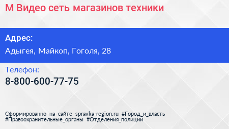 М.Видео, сеть магазинов техники по адресу Адыгея, Майкоп, Гоголя, 28 в дальнейшем Организация, размещена в следующих категориях: