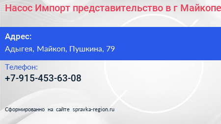 Насос-Импорт, представительство в г. Майкопе по адресу Адыгея, Майкоп, Пушкина, 79 в дальнейшем Организация, размещена в следующих категориях: