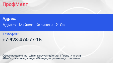 ПрофМелт по адресу Адыгея, Майкоп, Калинина, 210ж в дальнейшем Организация, размещена в следующих категориях: