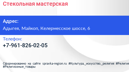 Стекольная мастерская по адресу Адыгея, Майкоп, Келермесское шоссе, 6 в дальнейшем Организация, размещена в следующих категориях: