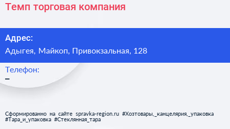 Темп, торговая компания по адресу Адыгея, Майкоп, Привокзальная, 128 в дальнейшем Организация, размещена в следующих категориях: