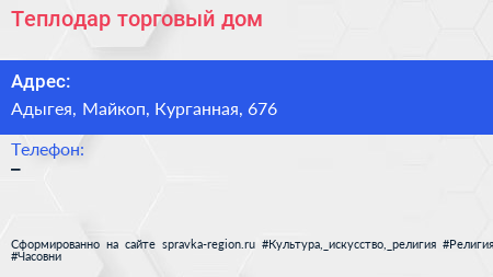 Теплодар, торговый дом по адресу Адыгея, Майкоп, Курганная, 676 в дальнейшем Организация, размещена в следующих категориях: