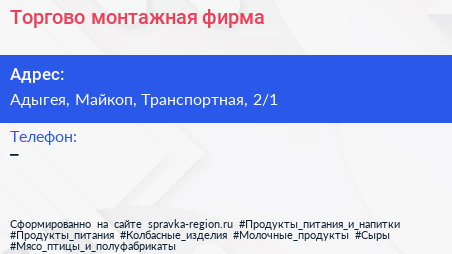 Торгово-монтажная фирма по адресу Адыгея, Майкоп, Транспортная, 2/1 в дальнейшем Организация, размещена в следующих категориях:
