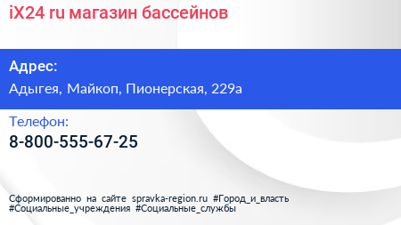 iX24.ru, магазин бассейнов по адресу Адыгея, Майкоп, Пионерская, 229а в дальнейшем Организация, размещена в следующих категориях: