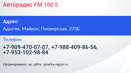 Авторадио, FM 100.5 по адресу Адыгея, Майкоп, Пионерская, 273Б в дальнейшем Организация, размещена в следующих категориях: