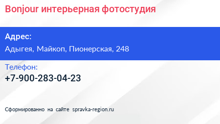 Bonjour, интерьерная фотостудия по адресу Адыгея, Майкоп, Пионерская, 248 в дальнейшем Организация, размещена в следующих категориях: