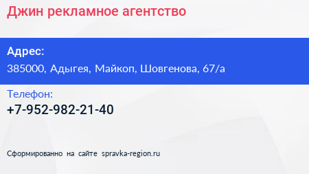 Джин, рекламное агентство по адресу 385000, Адыгея, Майкоп, Шовгенова, 67/а в дальнейшем Организация, размещена в следующих категориях: