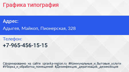 Графика, типография по адресу Адыгея, Майкоп, Пионерская, 328 в дальнейшем Организация, размещена в следующих категориях: