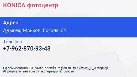 KONICA, фотоцентр по адресу Адыгея, Майкоп, Гоголя, 31 в дальнейшем Организация, размещена в следующих категориях: