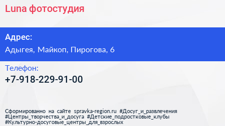 Luna, фотостудия по адресу Адыгея, Майкоп, Пирогова, 6 в дальнейшем Организация, размещена в следующих категориях:
