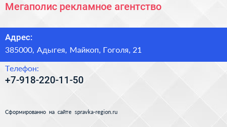Мегаполис, рекламное агентство по адресу 385000, Адыгея, Майкоп, Гоголя, 21 в дальнейшем Организация, размещена в следующих категориях: