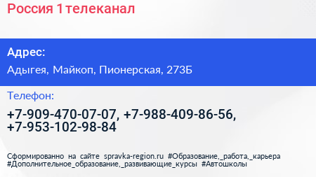 Россия 1, телеканал по адресу Адыгея, Майкоп, Пионерская, 273Б в дальнейшем Организация, размещена в следующих категориях: