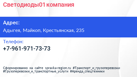 Светодиоды01, компания по адресу Адыгея, Майкоп, Крестьянская, 235 в дальнейшем Организация, размещена в следующих категориях: