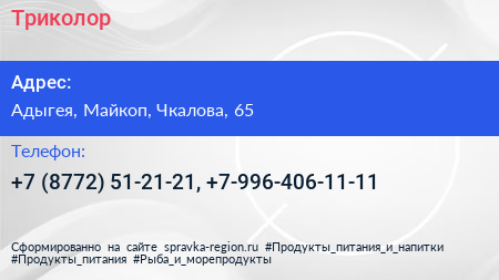 Триколор по адресу Адыгея, Майкоп, Чкалова, 65 в дальнейшем Организация, размещена в следующих категориях: