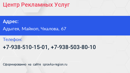 Центр Рекламных Услуг по адресу Адыгея, Майкоп, Чкалова, 67 в дальнейшем Организация, размещена в следующих категориях: