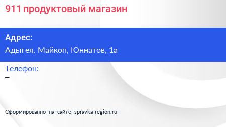911, продуктовый магазин по адресу Адыгея, Майкоп, Юннатов, 1а в дальнейшем Организация, размещена в следующих категориях: